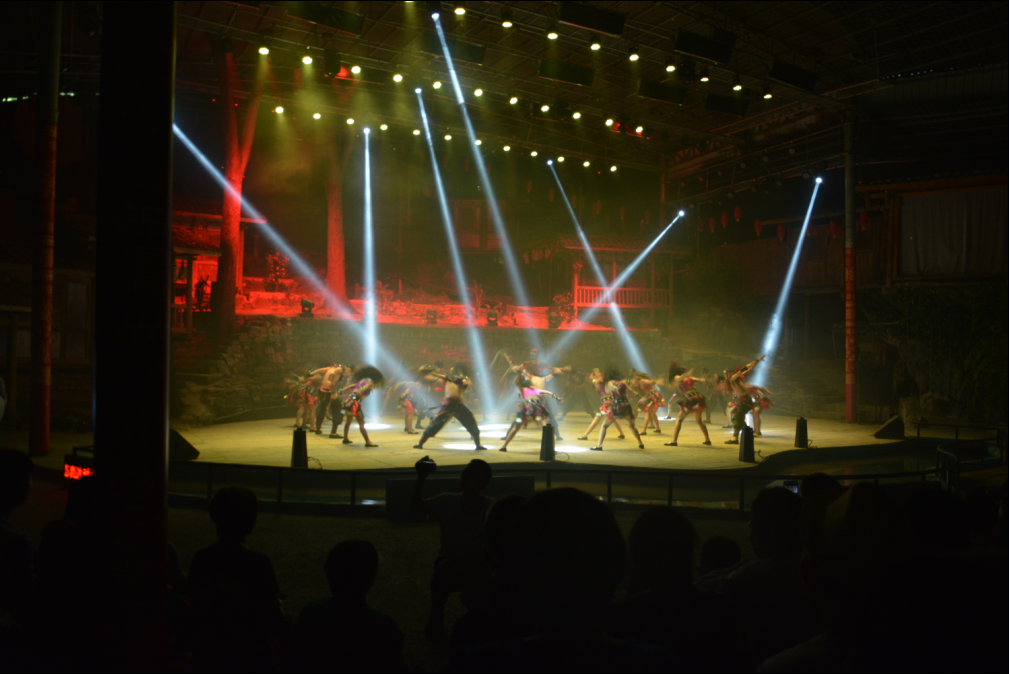 【漓水古越】是以展示廣西少數民族民俗風情為主題的大型民族表演,它集漓江山水、廣西少數民族文化及現代藝術創作,選用"真山真水"做為實景舞臺。 展現出了少數民族的"銅鑼文化""繡球文化" "山歌文化"等多種文化的表演。